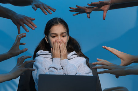 Cyber danger. Frightened girl using laptop while hands reaching towards her on blue background
