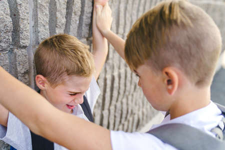 Cruel teenagers punching younger boy, physical intimidation, school bullying