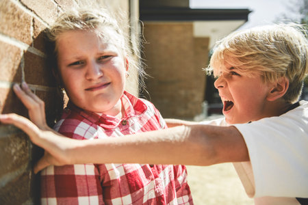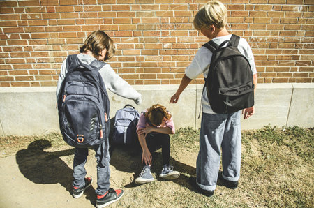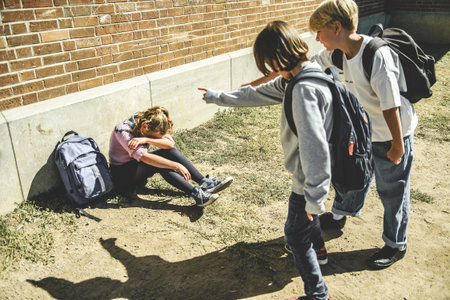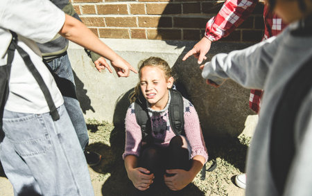 sad moment Elementary Age Bullying in Schoolyard, pointing a girl