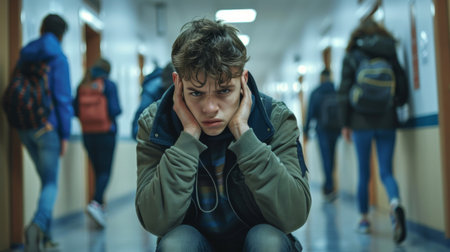 Teenager with learning difficulties crying in school corridor, blurred background with copy space