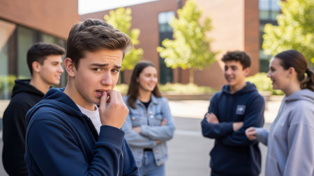 Young teen male anxious in social group outdoors with friends laughing nearby.