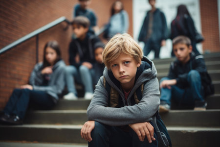 Depressed school boy sitting alone at stairs. Victim of school bullying. Stress and mental problem in childhood. Created with Generative AI