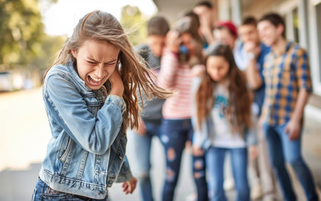A young girl covers her ears in agony as a group of children mock her in the background, illustrating the painful experience of bullying and social exclusion among youth