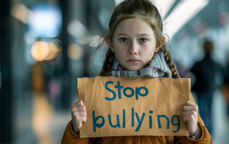 A young girl with a plaintive expression stands in a train station holding a 'Stop bullying' sign, symbolizing a silent yet powerful plea