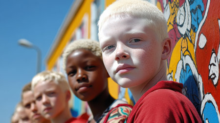 A group of diverse children stands confidently against a colorful mural wall, AI