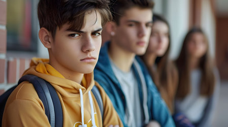 Sad bullied boy standing n the school corridor, covering his face. Two classmates behind him