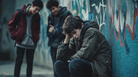Bullying. Sad boy sitting alone with two figures laughing in the background amidst urban graffiti.