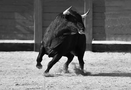 an aggressive bull with big horns on the traditional spectacle of bullfight