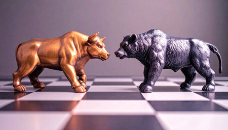 Metal bull and bear figurines locked in standoff on a black-and-white chessboard, symbolizing strategic battle in financial markets, studio lighting