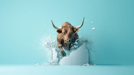 A powerful bull bursts through a white wall against a vibrant blue background, symbolizing strength and determination, perfect for visuals related to overcoming challenges.