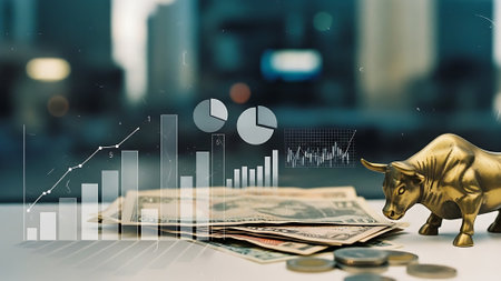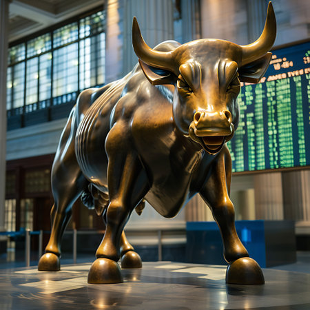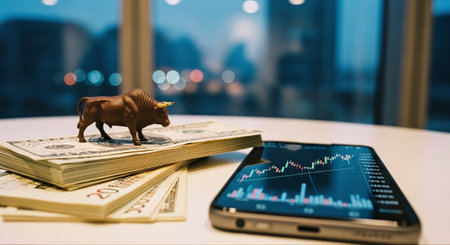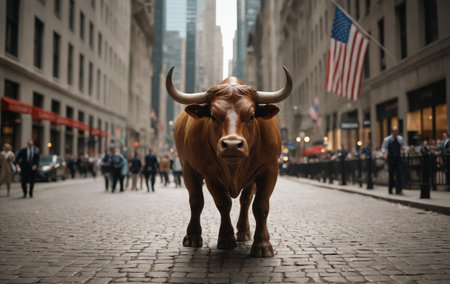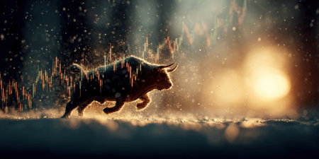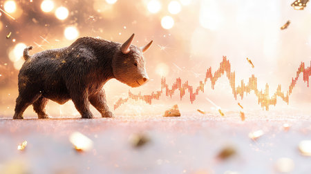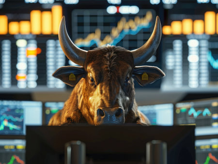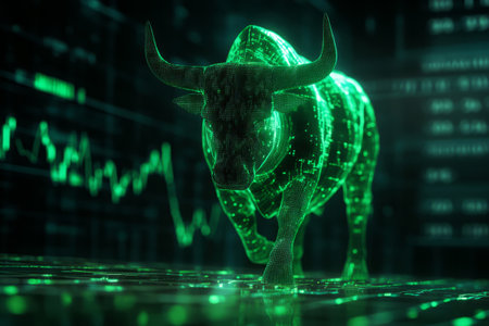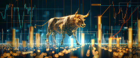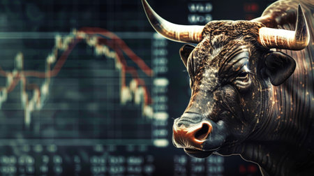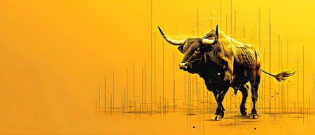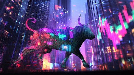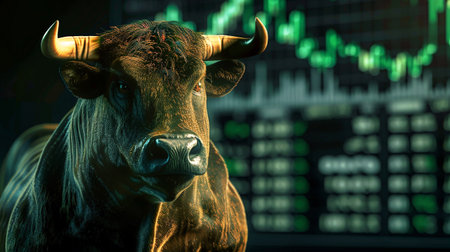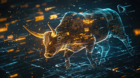 A powerful bull symbolizing strong market trends and investment potential. The digital backdrop emphasizes growth and technology in today