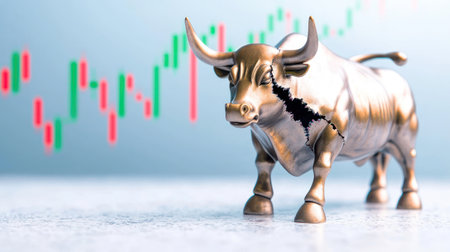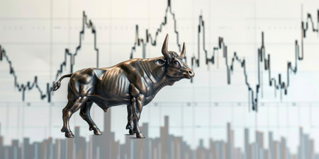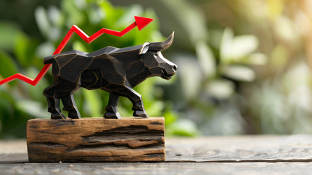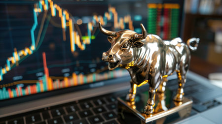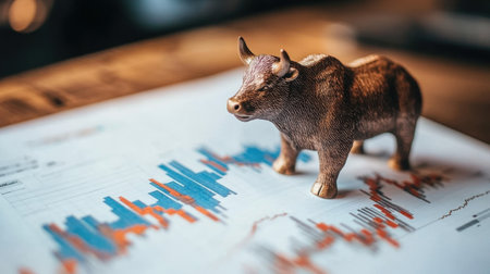 A detailed depiction of a bull figurine placed on a stock market chart, symbolizing financial growth and investment opportunities in the market landscape.