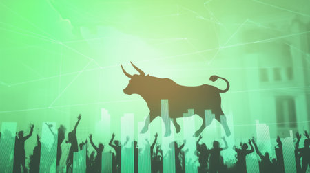 This image illustrates a bull market concept in finance, featuring a bull silhouette against a vibrant green backdrop. The crowd in the foreground symbolizes investor enthusiasm and market growth. ai generated.