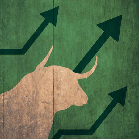 Pretty portrait bull and a upward arrow indicating the up of the stock market green background, stock market up and bull concept. Creative art with intense color. Poster for banner