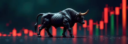 Black bull figurine symbolizing a rising stock market trend against a blurred background of candlestick charts, offering copy space for text or banners