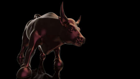 Wine red bull sculpture. Sculpted casting depicting a bull in dramatic contrasting light representing financial market trends under spot light. 3D illustration. 3D high quality rendering. 3D CG.