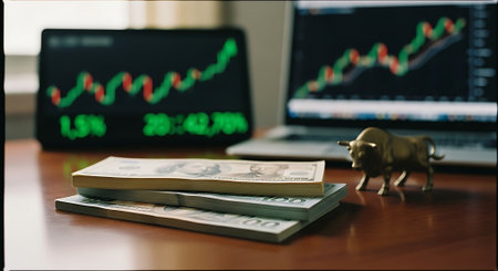 A bull figurine on a wooden desk with stacks of Indian rupee notes, a keyboard, and two screens displaying stock market charts.