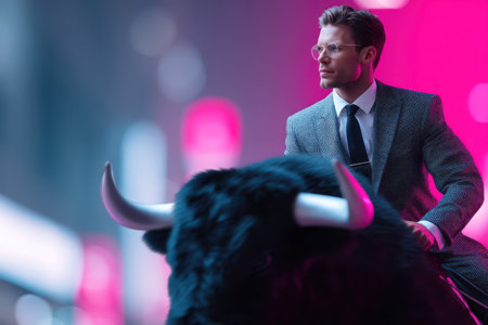 A confident young businessman rides cyber bull in vibrant cityscape with neon lights, exuding determination