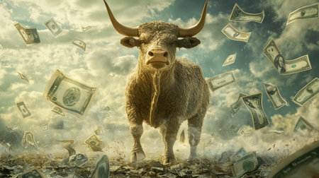 Financially successful bull with floating banknotes around it in a surreal, light-filled background, symbolizing prosperity