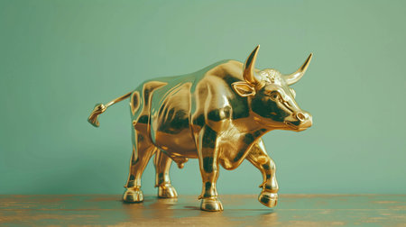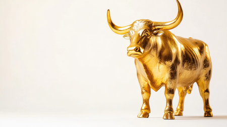 A shiny golden bull figurine stands prominently against a plain light background, symbolizing strength, wealth, and positive market trends in finance, evoking a sense of prosperity