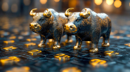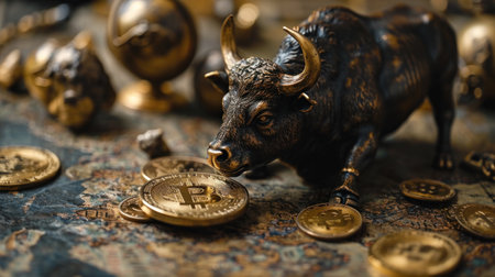 A close-up of two metallic bulls standing on a surface with cryptocurrency symbols, representing bullish trends in the financial market and cryptocurrency industry.