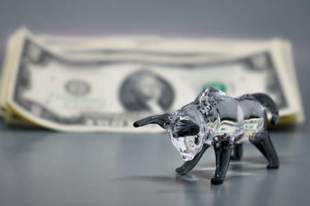 Glass figurine of a bull on a background of US dollars. Concept: business, stock exchange, finance, symbol of 2021. Selective focus. Figurine of a bull with banknotes on a gray background.
