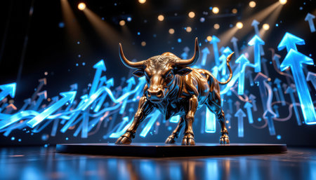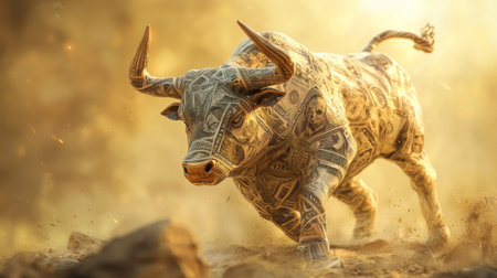 Dynamic scene of a golden bull with financial data glowing around it, representing success in the stock market