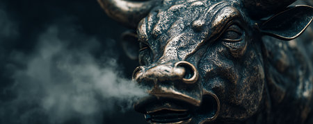 Bronze buffalo statue with smoke on dark background, panoramic banner