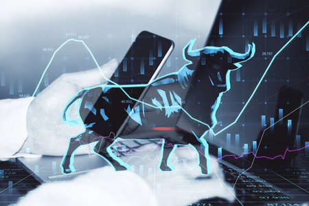 Concept of bullish market. Close up of businessman hands using laptop and smartphone with glowing bull hologram over forex chart on blurry background. Trade and investment concept. double exposure