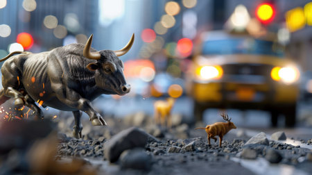 This imaginative image features a dynamic bull charging through a bustling city street, while a miniature deer navigates the chaos. Bright city lights blur in the background, creating a vibrant and surreal atmosphere.