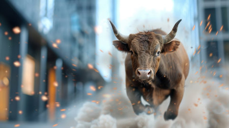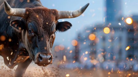A vibrant, energetic scene blending a fierce bull with a bustling city skyline, illuminated by luminous market graphs representing dynamic financial momentum.