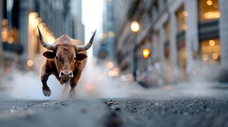 A majestic bull charges through a bustling urban street, leaving a cloud of dust in its wake, symbolizing raw power and the spirit of nature amidst city life.