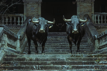 Corporate investment stichfeld and bulls walking stairs in the dark