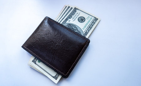 leather wallet full of money on a wooden table and one hundred US bills with a portrait of President Franklin. One hundred dollar bills in cash. paper money background.