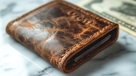 A worn leather wallet with visible texture placed on a marble surface next to a cash bill, symbolizing personal finance, savings, and budgeting