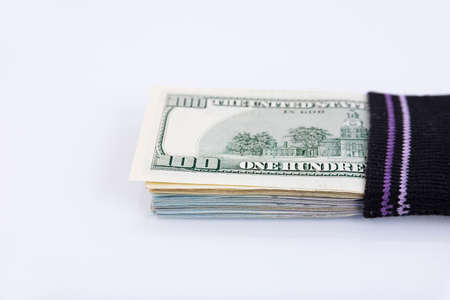 Money sock. a bundle of American hundred dollar bills hidden in a sock. Savings and storage concept. Selective focus
