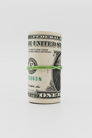 US dollar banknotes rolled up on a white tabletop with text space