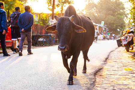 Rishikesh, Uttarakhand, India - December 1, 2019: Cows on the streets of the holy city Rishikesh, India