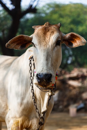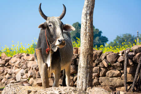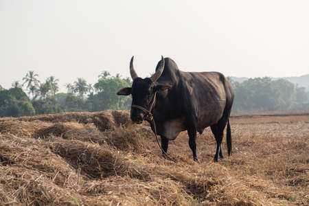 Gray beautiful sacred bull Zebu, subspecies of wild, big bull in India Goa
