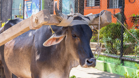 Ox with yoke in front of wooden wagon at Ometepe island in Nicaragua Central America