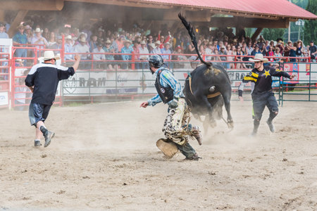 Williams Lake, British Columbia/Canada - July 2, 2016: cowboys run from angry bull during bull riding competition at the 90th Williams Lake Stampede, one of the largest stampedes in North America.