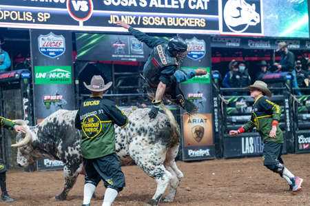 LAS VEGAS - MAY 23 : Number one Bull rider in the world Joao Ricardo Vieira Participating in a Bull riding Competition at the Las Cowboy Standing , a PBR cometition held in Las Vegas on May 23 2015