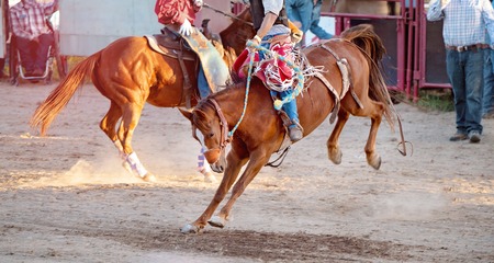 Cowboy riding a bucking saddle bronc at a country rodeo Australia