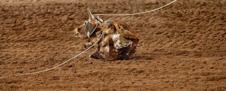 A calf falls to the dusty ground after being caught by ropes at a team event at an Australian outback country rodeo