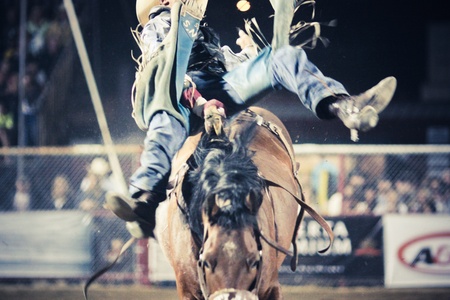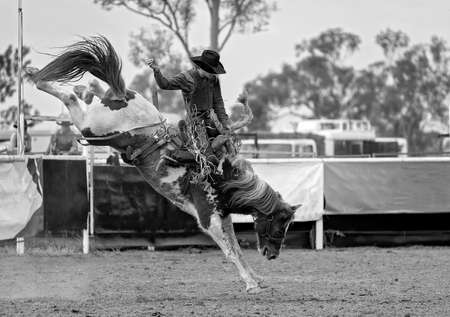 Cowboy riding a bucking bronc horse in a rodeo competition in Australia