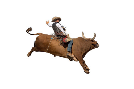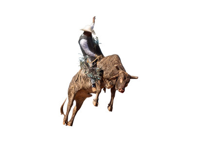 A cowboy competing in a bull riding event at a country rodeo, isolated on white background, room for text, copy space
