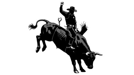 A dynamic black and white silhouette of a cowboy expertly balancing on a fiercely bucking bull during a rodeo event.