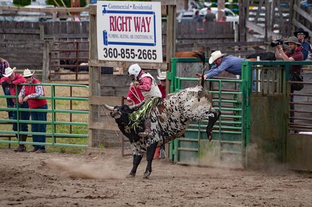 SEDRO WOOLLEY, WA/USA - JULY 4, 2019: This bull riding owboy participates at the annual 4th of July Loggerodeo in Sedro Woolley, Wa. one of the longest running rodeos in the state.