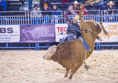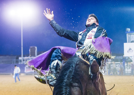 LOGANDALE , NEVADA - APRIL 10 : Cowboy Participating in a Bucking Horse Competition at the Clark County Fair and Rodeo a Professional Rodeo held in Logandale Nevada , USA on April 10 2015