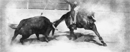 Bullfight on horseback. Typical Spanish bullfight. black and white drawing